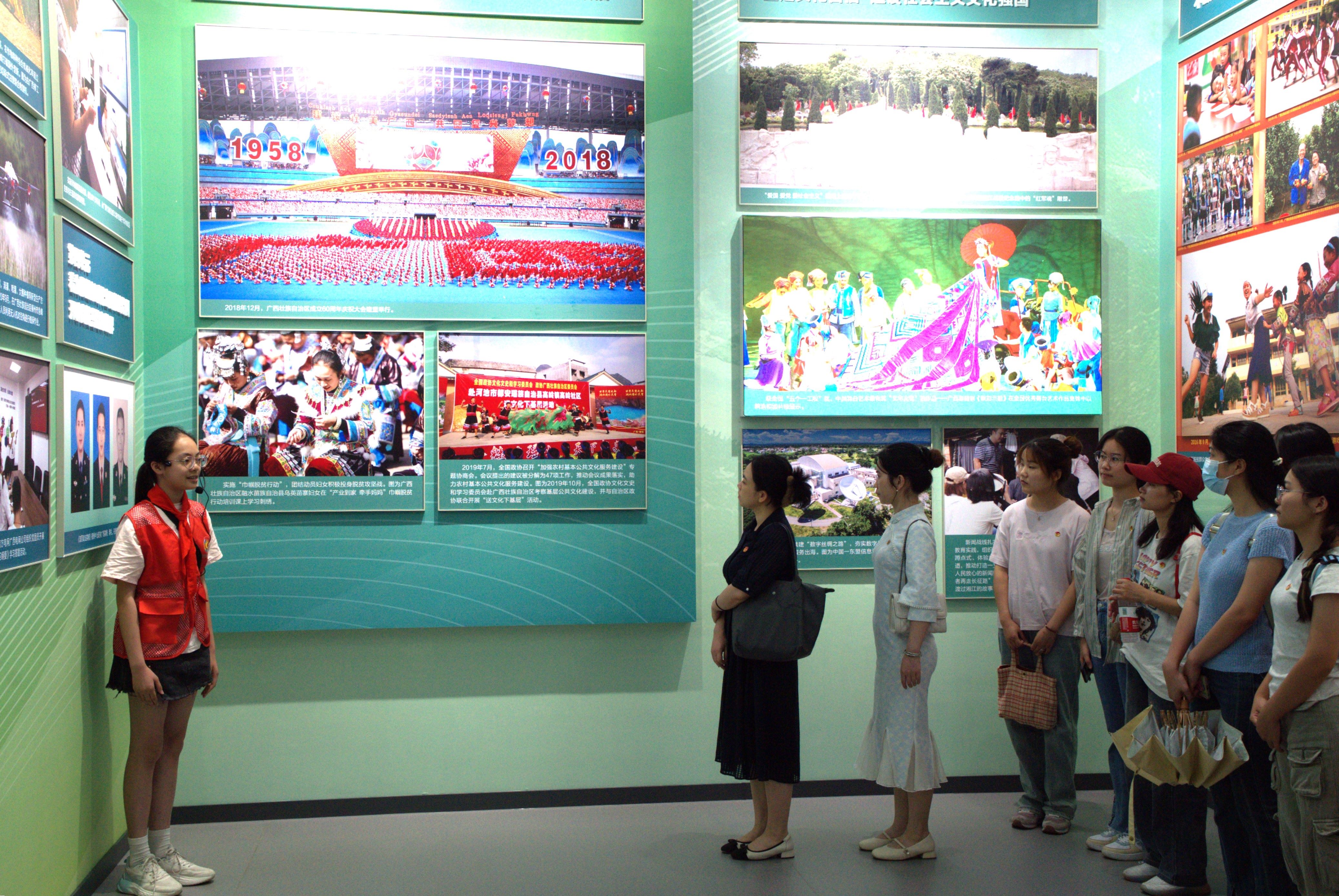 “青马”学员首先前往广西壮族自治区展览馆。学员们跟随红领巾讲解员的步伐先后参观了“烽火南疆”“巨变壮乡”“潮涌八桂”“壮美广西”四大展厅。在参观过程中,学员们认真聆听讲解,不时驻足观看一系列生动的场景模型、珍贵的历史图片和档案资料,进一步了解了广西这片土地上发生过的英雄事迹、感人故事和伟大成就。