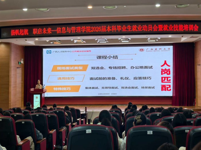 会上,学院党委副书记蒋鹏作动员讲话,就同学就业情况提出三点建议:一是转变就业观念,就业是“星辰大海”,不是“独木桥”;二是扎实做好准备,以 “真功夫”赢得“好机会”;三是积极调整心态,坚韧乐观,锻造应对挑战的“强心脏”。随后,辅导员谭艳红详细讲解2026届毕业生就业须知,为毕业生答疑解惑。最后,贝宝珍老师进行就业技能培训,围绕现场面试,通用技巧,特殊技巧等实用内容进行授课,切实提升毕业生就业实操能力。