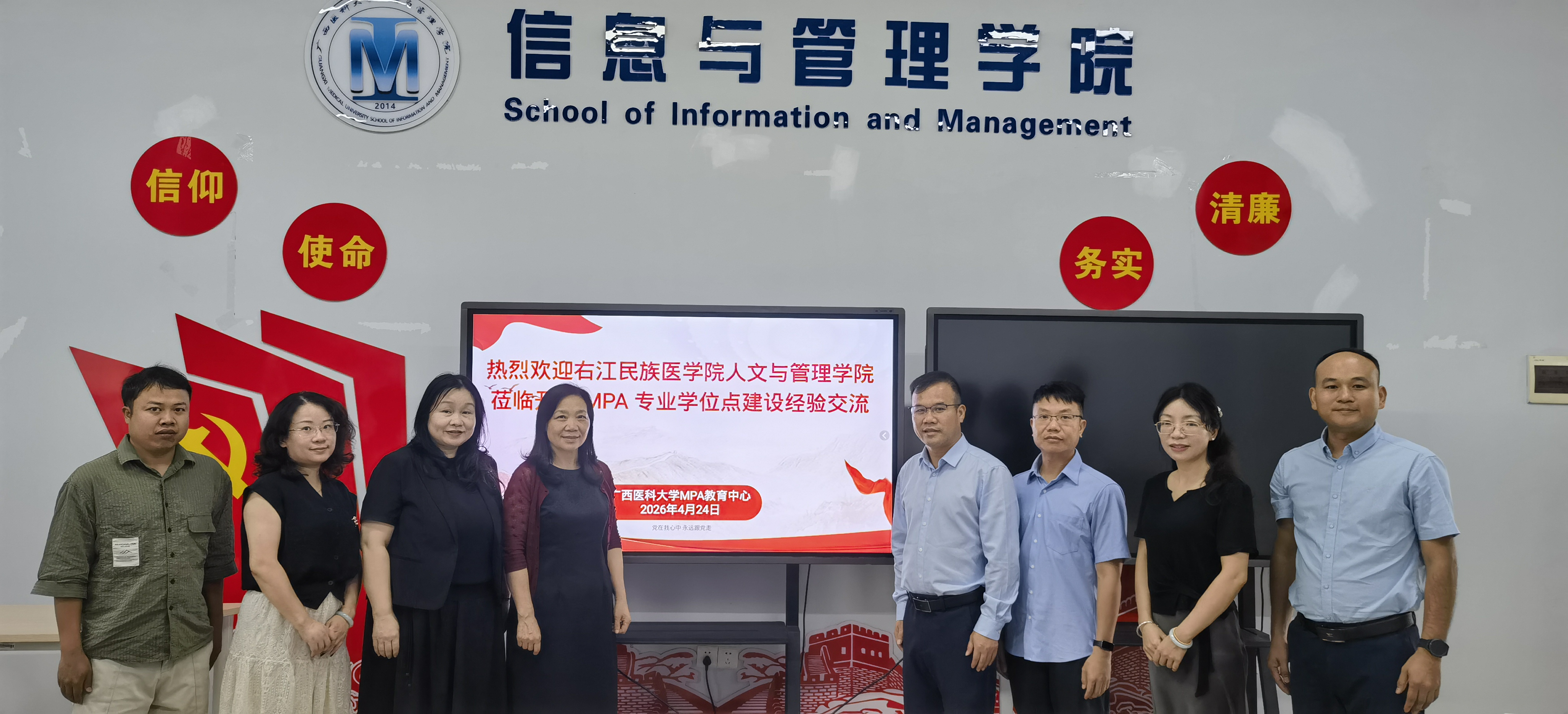 4月24日下午,右江民族医学院人文与管理学院党委书记、院长李常应一行4人到访风车动漫 ,就公共管理硕士(MPA)专业学位点建设开展专题经验交流。风车动漫 党委书记闵晓阳、院长何慧敏等热情接待了来访同仁,并举行座谈会。