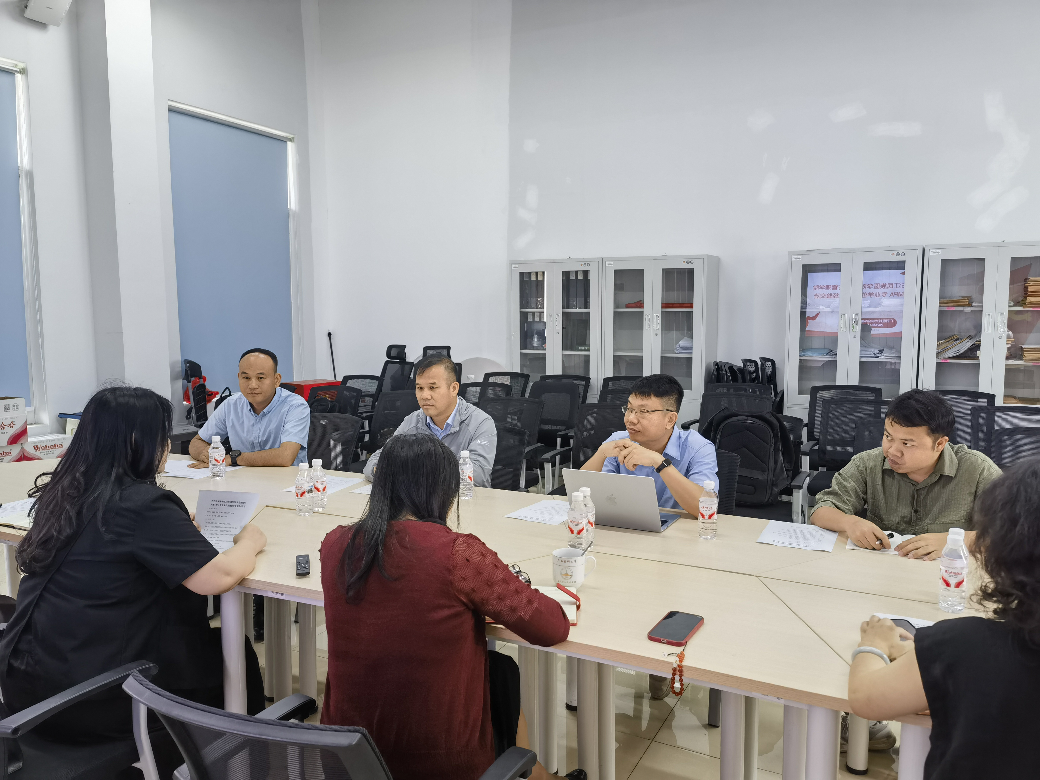 座谈会上,闵晓阳书记对右江民族医学院人文与管理学院一行的到访表示欢迎。何慧敏院长介绍了学院学科建设与人才培养的基本情况,重点分享了MPA学位点的建设情况及学位点评估工作的经验与做法。双方围绕评估准备、案例教学等具体问题进行了深入探讨,现场气氛融洽。与会人员一致认为,此次交流为两院MPA教育高质量发展提供了有益借鉴,也为未来进一步深化合作奠定了良好基础。